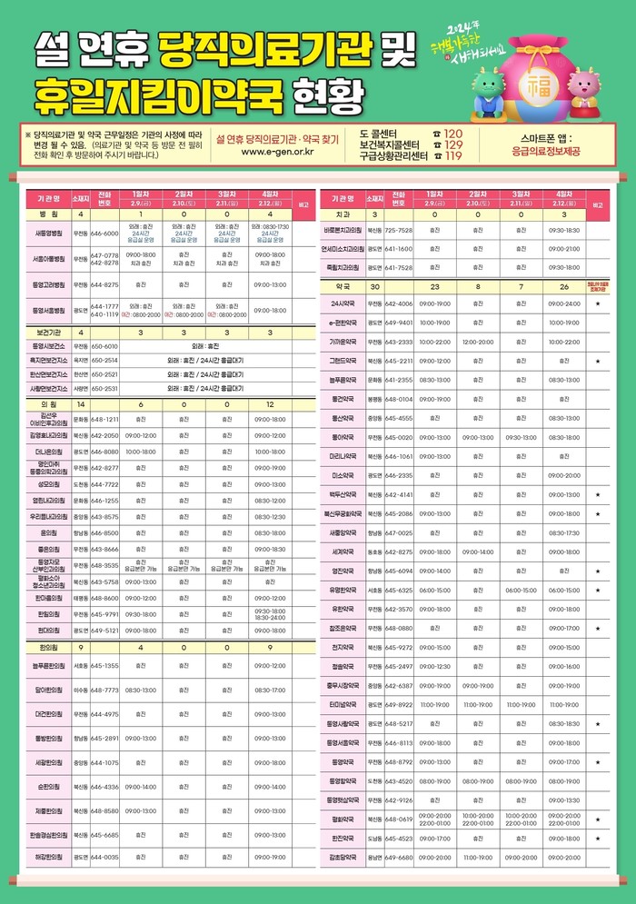 시민들이 연휴 기간 의료기관과 약국 이용 불편을 겪지 않도록 총 64개소(의료기관 34개소, 휴일지킴이약국 30개소)를 일정별로 지정·운영하고, 응급의료기관은 24시간 응급환자 비상진료체계를 유지하며 보건소에서는 응급진료대책 상황실을 운영해 병·의원 및 약국 운영 상황을 점검한다.