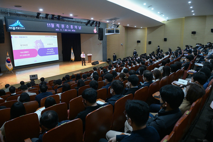 ▲최민호 세종시장이 지난 7일 시청 여민실에서 열린 ‘11월 직원 소통의 날’에서 강연을 진행했다.(사진=세종시) |