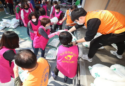 | ▲대구 달서구 사랑해밥차 무료급식소에서 삼익신협 두손모아봉사단과 자원봉사자들이 한 독지가가 기부한 햅쌀을 나르고 있다. (사진= 뉴스1) |