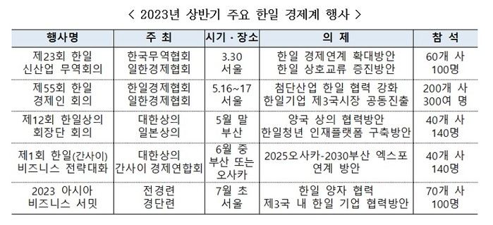이같은 분위기 속에 5월 16일 한일경제협회와 일한경제협회는 공동으로 한일 경제계 간 대표적인 교류 행사인 제55회 한일 경제인 회의를 서울에서 열고, 2018년 이후 중단한 제12회 한일 상공회의소 회장단 회의도 5월 말 부산에서 6년 만에 재개할 예정이다.