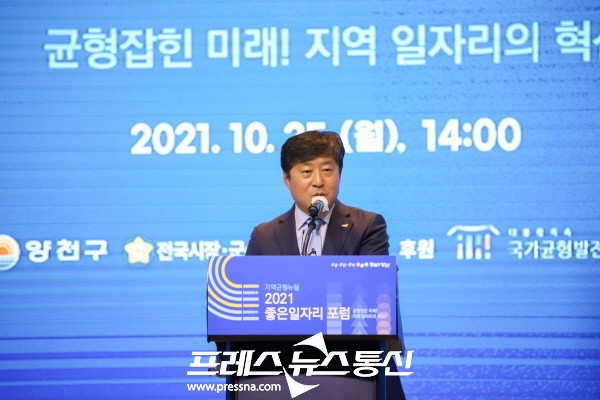 [프레스뉴스] 김대일 기자= 전국시장·군수·구청장협의회 황명선 대표회장(논산시장)은 10월 25일 오후, 서울 여의도 글래드 호텔 BLOOM홀에서 열린 「지역균형뉴딜 2021 좋은 일자리포럼」에서 “최근 수도권 비대화와 소멸 위기 지역이 늘어나 다양한 사회경제적 문제가 발생하고 있다”며, “이 문제의 해결을 위해 기초지방정부 주도의 좋은 일자리 창출을 위해 지역 균형발전이 반드시 필요하다”이라고 밝혔다.
