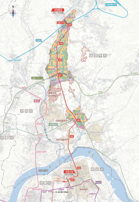 ‘강동하남남양주선 광역철도’는 3기 신도시 남양주 왕숙·왕숙2지구의 교통개선을 위한 사업이다. 서울도시철도 9호선 연장으로 서울 강동구에서 경기 하남시를 거쳐 남양주시 진접2지구까지 연장 17.59km, 정거장 8개소, 차량기지 1개소를 신설할 예정이다. 총사업비 2조 8,240억 규모의 철도 노선으로 2031년 개통을 목표로 추진 중이다.