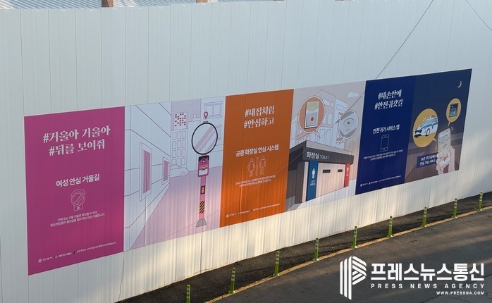 23일 안양시에 따르면, 안양시 여성안전실무협의체는 지난해 제5차 회의에서 방범시설물의 대시민 홍보 필요성이 제기에 따라, 시민들이 일상에서 자연스럽게 방범시설물을 인지하고 활용할 수 있는 방안으로 공사현장 가설울타리에 방범시설물을 안내하는 디자인 적용을 추진했다.