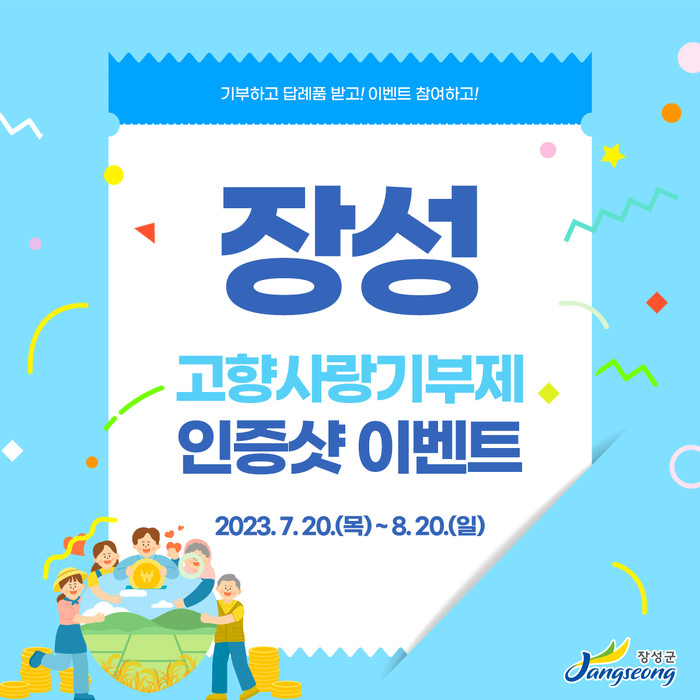 [전남=프레스뉴스] 차윤기 기자= 전남 장성군이 고향사랑기부제 활성화를 위한 ‘고향사랑기부 인증샷 이벤트’를 오는 8월 20일까지 연다.