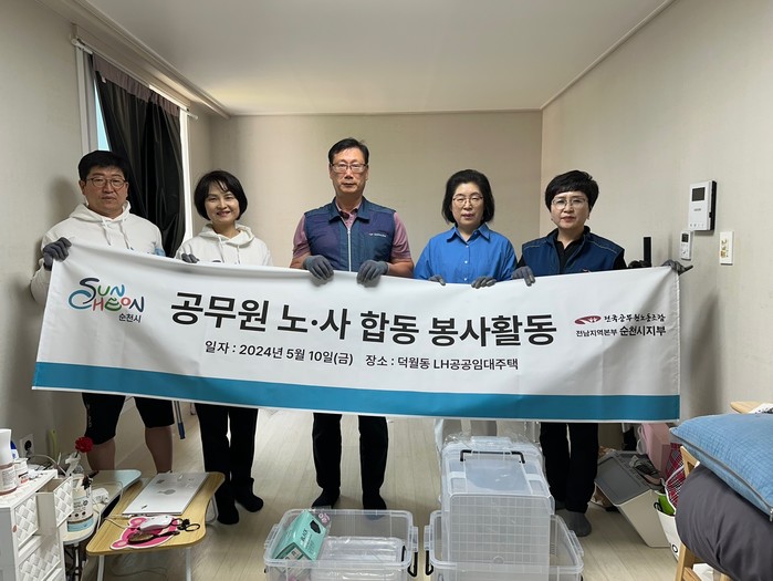 이날 순천시 공무원 노·사는 덕월동 소재 취약계층 가정을 방문해 정리·정돈 및 청소 봉사를 실시하고 해당 가정을 격려했다.