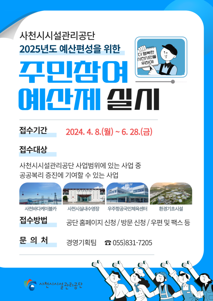 [프레스뉴스] 정호일 기자= 사천시시설관리공단은 8일부터 6월 28일까지 사천시민을 대상으로 신규 및 개선사업 발굴을 위한 ‘주민참여예산제’를 실시한다.