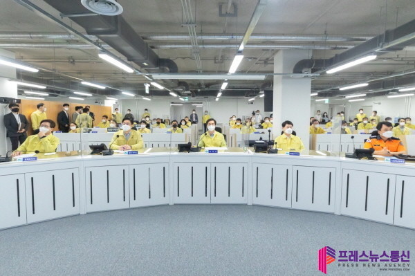 ▲ 22일 오전 경기도청 전시종합상황실에서 김동연 경기도지사와 오병권 행정1부지사, 이한규 행정2부지사, 염태영 경제부지사, 각 실·국장 및 관계자들이 참석한 가운데 2022년 을지연습 최초 상황보고가 열리고 있다.(사진=경기도북부청) |