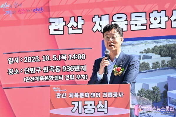| ▲2023년 10월 5일 열린 관산체육문화센터 건립 기공식에서 이민근 안산시장이 인사말을 하고 있다.(사진=안산시) |