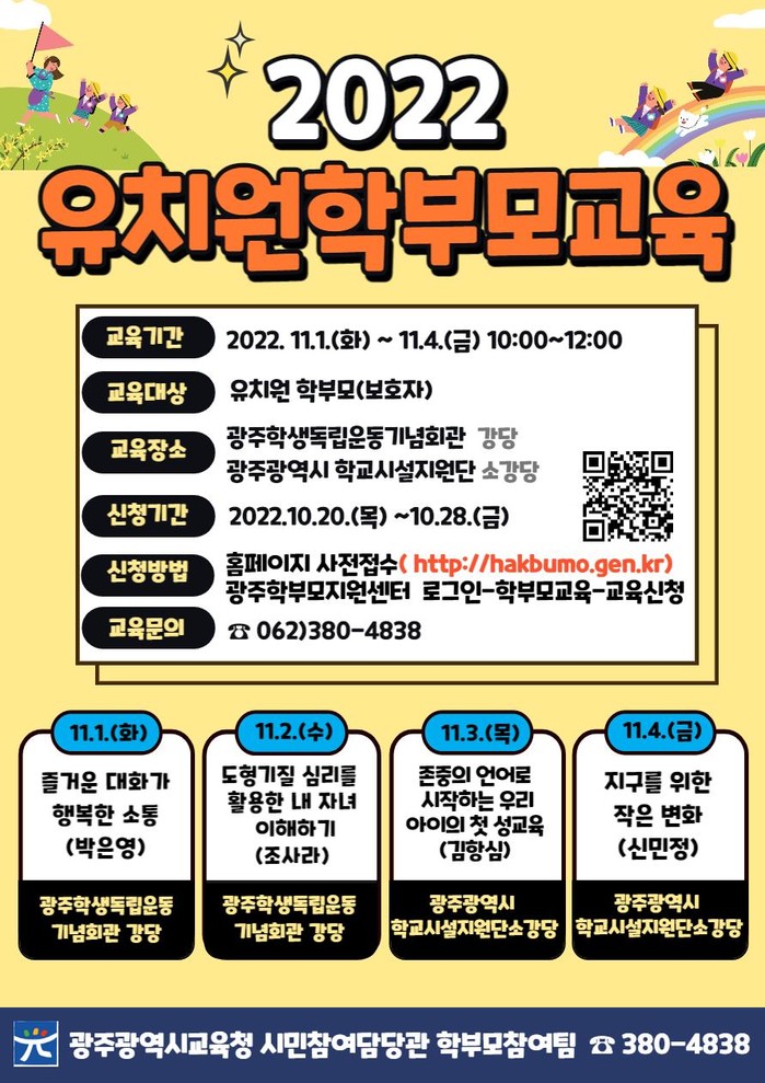 [광주=프레스뉴스] 강래성 기자= 광주시교육청이 11월1~4일 총 4회에 걸쳐 유치원 부모를 대상으로 광주학생독립운동기념회관과 광주학교시설지원단에서 유치원 학부모교육을 운영한다.