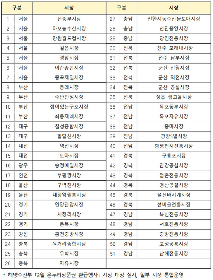 | ▲현장 환급행사 참여 전통시장 51곳. (표=농림축산식품부) |
