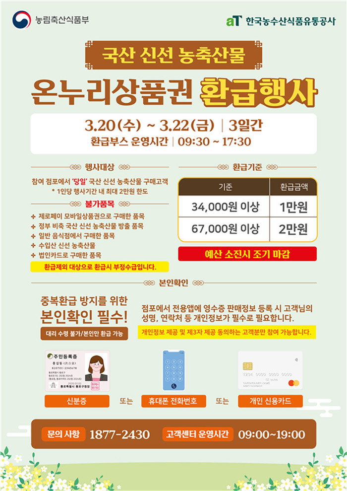 소비자들은 행사 추진 시장에서 국산 신선 농축산물을 구매하고 영수증과 신분증을 가지고 시장 내 환급 부스에 가면 본인 확인 후 온누리상품권을 환급받을 수 있다.