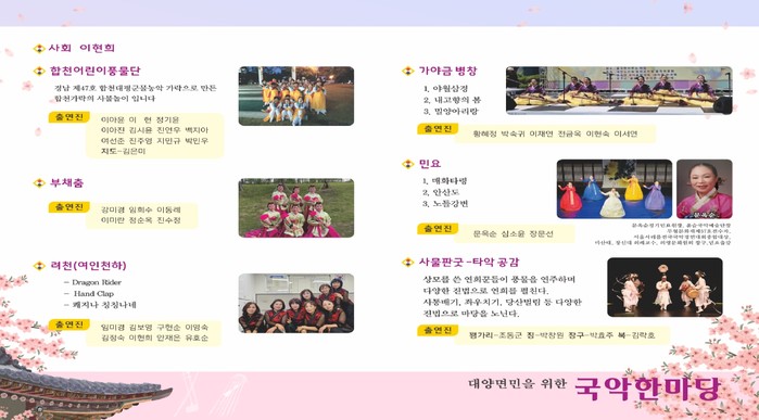 ▲합천군은 오는 6월 7일 오전 11시 30분 대양면복지회관 앞마당에서 ‘문화소외지역 찾아가는 국악한마당’ 공연을 개최한다. (사진=합천군) |