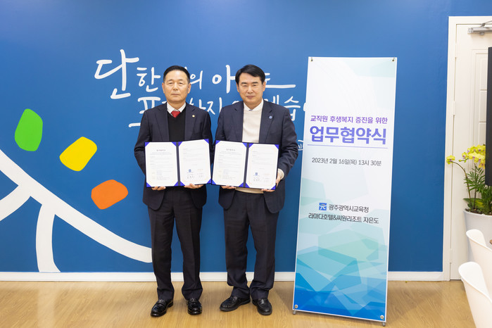 [광주=프레스뉴스] 강래성 기자= 광주시교육청이 16일 라마다프라자 호텔&씨원리조트 자은도와 교직원의 후생 복지 증진을 위한 업무협약을 체결했다.