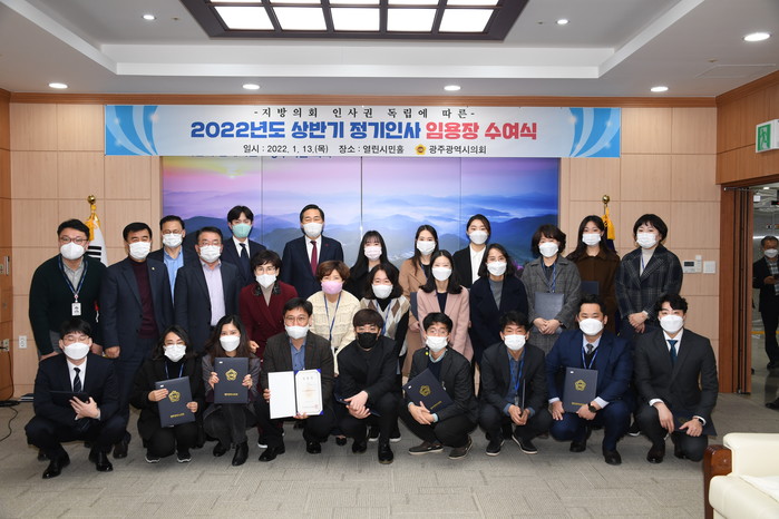 [광주=프레스뉴스] 강래성 기자= 광주광역시의회(의장 김용집)는 1월 13일 2022년도 상반기 정기인사에 따른 임용장 수여식을 가졌다.