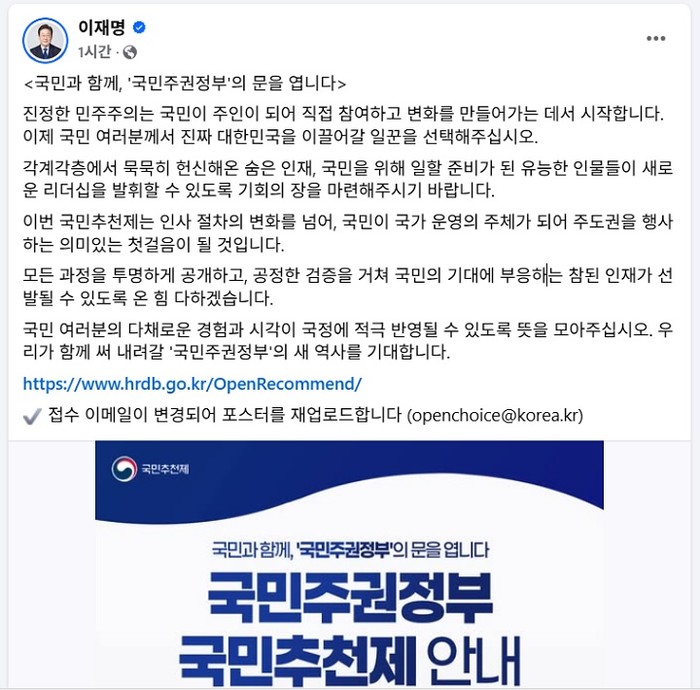 아울러 "이번 국민추천제는 인사 절차의 변화를 넘어, 국민이 국가 운영의 주체가 돼 주도권을 행사하는 의미 있는 첫걸음이 될 것"이라고 강조했다.