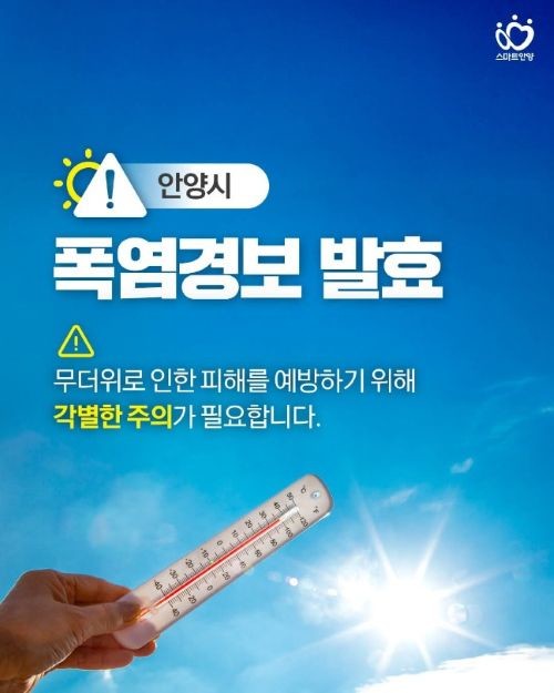 최대호 안양시장은 “시민 여러분의 안전과 건강이 최우선”이라며 “폭염이 심한 시간대에는 야외 활동을 가급적 자제하고, 모두가 함께 건강하게 여름을 이겨내길 바란다”고 말했다.