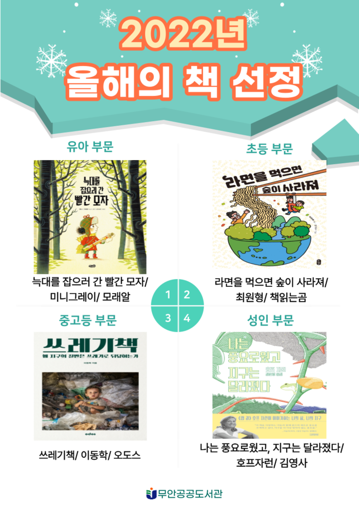 무안공공도서관 올해의 책 선정은 장학사, 교사, 사서 등으로 구성된 도서선정 TF팀과 이용자투표를 통해 4개 분야(유아, 초등, 중·고등, 성인)에서 4권을 선정하였다.