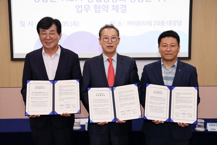 5일 서울 엠디엠그룹 본사에서 열린 업무협약식에는 김성 장흥군수, 문주현 엠디엠그룹 회장, 전종순 농협중앙회 장흥군지부장이 참석했다.