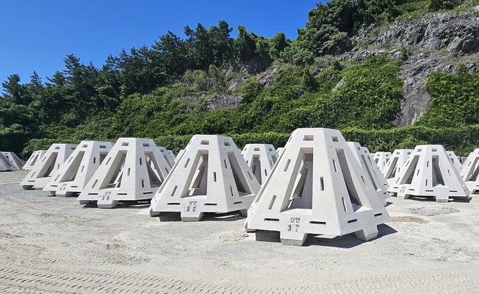 ▲조피볼락 산란 서식장 조성에 투하되는 인공어초 제작 전경/신안군 제공 |