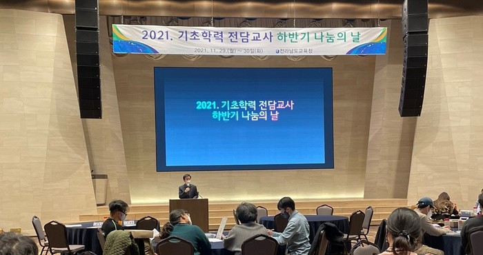 [전남=프레스뉴스] 강래성 기자= 전라남도교육청이 11월 29일(월) ~ 30일(화) 진도 쏠비치에서 '2021년 기초학력 전담교사 나눔의 날' 행사를 열어 지난 1년간의 운영성과를 공유하고, 2022년 활성화 방안을 제시하는 시간을 가졌다. 전남교육청은 2021년 기초학력 전담교사 48명(문해력 37명, 수해력 11명)을 22개 교육지원청 관내 학교에 배치해 초등 1~2학년 학생의 한글 미해득 및 수해력 부진학생을 지도했다.