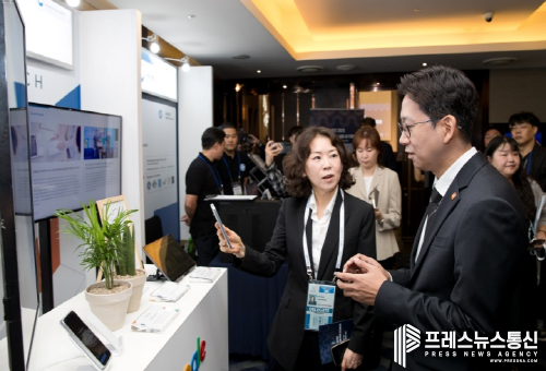 ▲배경훈 과학기술정보통신부 장관이 5일 오전 인천광역시 연수구 쉐라톤그랜드호텔에서 열린 'APEC 글로벌 디지털 AI 포럼' 에 참석해 구글 전시부스에서 설명을 듣고 있다. (사진= 과학기술정보통신부) |