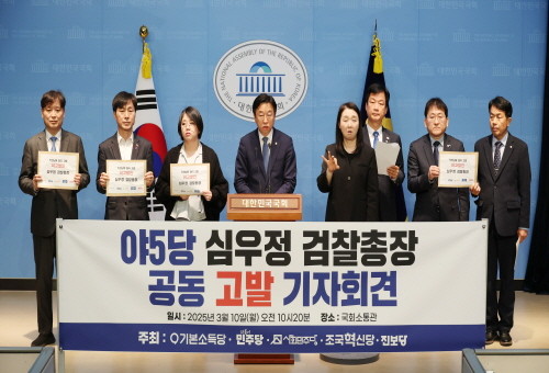 민주당과 조국혁신당, 진보당, 기본소득당, 사회민주당 등 야 5당은 이날 국회에서 기자회견을 열고 심 총장을 공수처에 고발한다고 밝혔다.