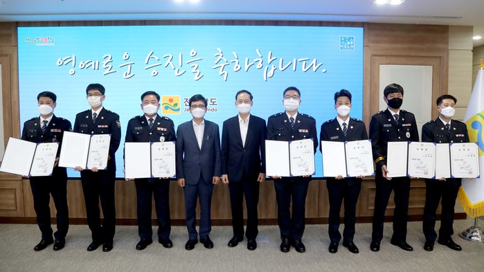전남도와 자치경찰위원회는 또 이날 자치경찰공무원 11명(경감 1.경위 8.경사 1. 경장 1)의 승진 임용식도 개최했다. 지금까지 경찰공무원 임용권은 지방자치단체에 없었지만, 올해부터 자치경찰제가 시행되면서 자치경찰에 대한 임용권 일부가 도지사와 위원회에 위임됐다.