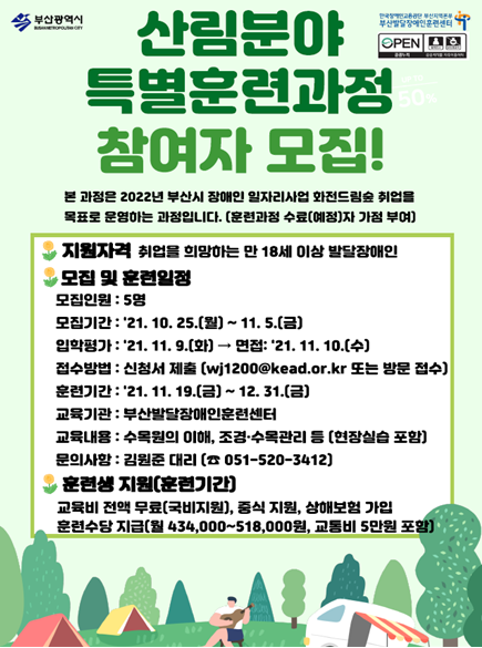 부산시는 산림녹지 분야 공공일자리 시범사업을 추진하기 위해 오는 11월 5일까지 사전 직무훈련에 참여할 발달장애인을 모집한다고 밝혔다.