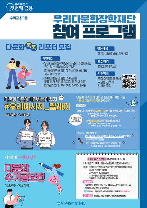 세 가지 프로그램 모두 우리다문화장학재단과 다문화가정에 대해 관심이 있는 남녀노소 누구나 참여할 수 있으며, 우수작으로 선정될 경우 소정의 상금이 제공된다. 자세한 내용은 우리다문화장학재단 홈페이지에서 확인할 수 있다.