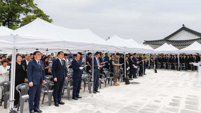 이날 행사에는 김윤철 군수를 비롯해 보훈단체장과 회원, 보훈가족, 기관·사회단체장, 군민, 학생 등 700여 명이 참석해 나라를 위한 희생정신을 되새겼다. 오전 10시, 전국적으로 울린 사이렌에 맞춘 1분간의 묵념을 시작으로 헌화와 분향, 추념사, 헌시 낭송, 현충일 노래 제창 등이 경건한 분위기 속에서 진행됐다.