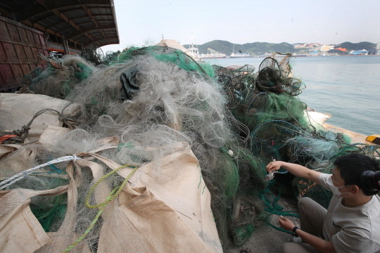 ▲부산 서구 부산수산물공판장에서 대형기선저인망수협이 제주 이어도 인근 소 코트라 해역에서 수거한 침적 쓰레기를 처리하고 있다.(사진= 뉴스1) |