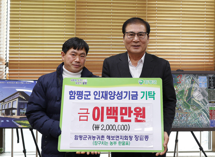 함평군은 5일 “함평군귀농귀촌 해보면지회장 장필종(장구치는 농부 한꿀표)이 이날 오전 군수실에서 열린 기탁식에서 인재양성기금 200만원을 기탁했다”고 밝혔다.