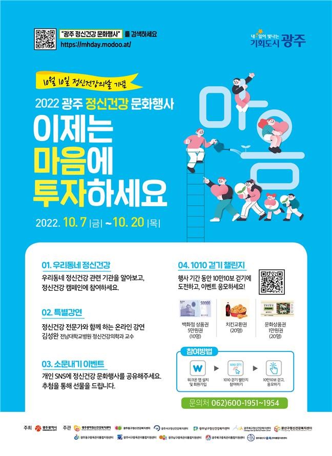 광주시가 주최하고 광주광역정신건강복지센터, 5개구 정신건강복지센터, 5개구 중독관리통합지원센터가 공동으로 주관하는 이번 행사는 ‘이제는 마음에 투자하세요’라는 주제로, 정신건강 홍보주간(10월7일~10월20일) 진행되며, 온·오프라인에서 동시에 참여할 수 있다.