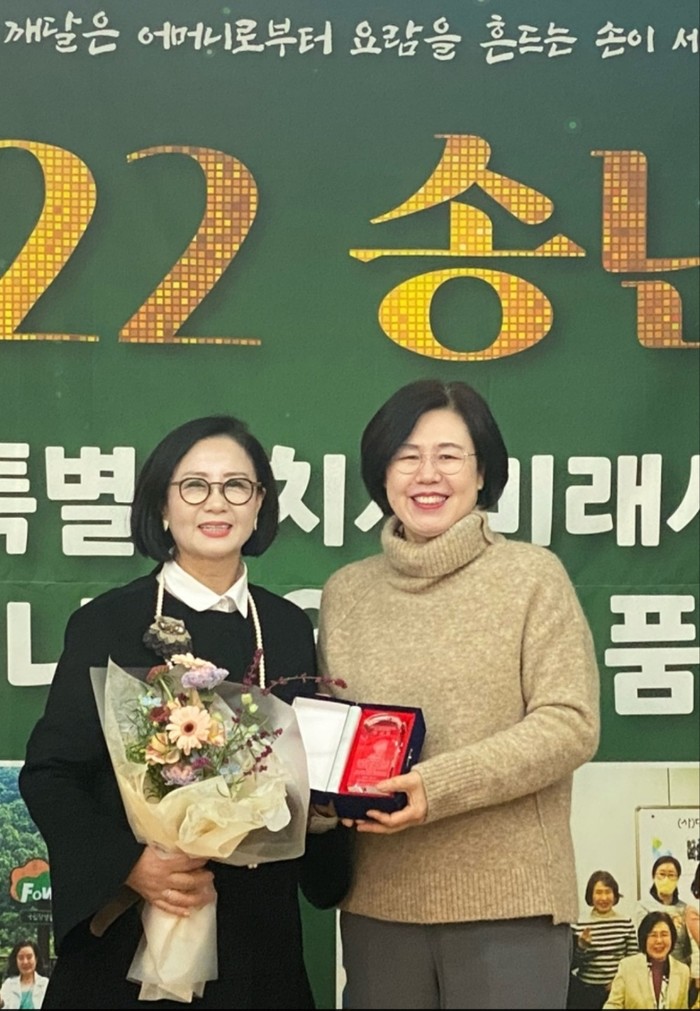 ▲ 대한어머니회 세종시부 박희숙회장(왼쪽)이 상장을 수여받았다(사진=세종지부) |