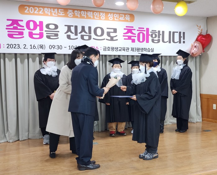 [광주=프레스뉴스] 강래성 기자= 금호평생교육관이 지난 16일에 2022학년도 중학학력인정과정 성인교육 졸업식을 개최했다.