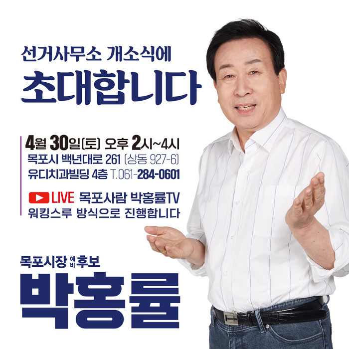[전남=프레스뉴스] 강래성 기자= 박홍률 목포시장 선거 예비후보는 목포시내 하당 백년대로 주변에 마련한 선거사무실에서 30일 오후 2시 개소식을 열고 시민들에게 6·1지방선거에 출마하는 입장과 각오를 밝힐 예정이다.