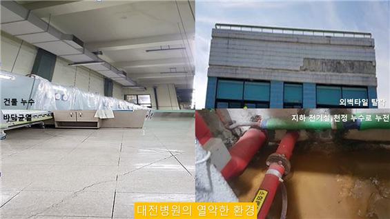 구체적인 문제로는 낡고 오래된 병원시설, 의료장비 노후화를 꼽았다. 1977년 설립된 태백병원, 79년 설립된 창원병원 등 40년이 넘는 병원들의 시설낙후, 특히 시설 낙후를 넘어서 안전성 문제가 있는 대전병원의 심각한 병원시설 노후화가 심각했다. 의료장비는 최대 내용연수를 20년을 초과한 장비를 사용하는 등 심각성이 들어났다. 21년 6월말 기준 산재병원들이 보유한 3천만원 이상 고가의료장비는 총 402점(716억)이며, 내용연수 초과장비는 170점으로 절반에 가까운 42.3%(279억)에 이른다고 밝혔다.