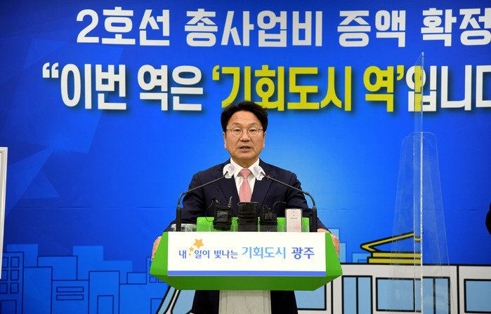 강기정 광주광역시장은 29일 오후 시청 브리핑룸에서 기자회견을 열고 “이번 총사업비 확정으로 지방 최초의 순환노선 건설 사업인 도시철도 2호선 사업이 정상 궤도에서 추진할 수 있게 됐다”고 밝혔다.