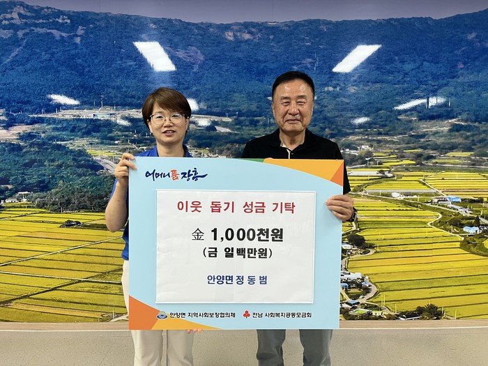 백수영 안양면장은 “정동범님께 진심으로 감사드리며 기탁해 주신 성금은 어려운 이웃을 위해 소중히 사용하겠다”며 “앞으로 촘촘한 복지 안전망을 구축해 복지 사각지대가 없도록 안양면민의 복지 향상과 사각지대 해소를 위해 최선을 다하겠다”고 말했다.