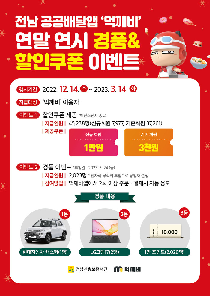 [전남=프레스뉴스] 강래성 기자= 전라남도가 공공배달앱 ‘먹깨비’의 이용 활성화를 위해 오는 3월 14일까지 이용자 대상 푸짐한 경품 이벤트를 진행하고 있다.
