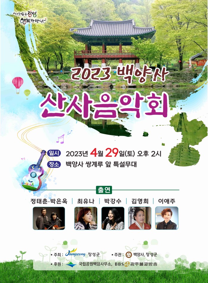 [전남=프레스뉴스] 차윤기 기자= 4월의 마지막 주말인 오는 29일, 장성 백양사에서 싱그러운 봄을 만끽할 수 있는 음악회가 열린다.