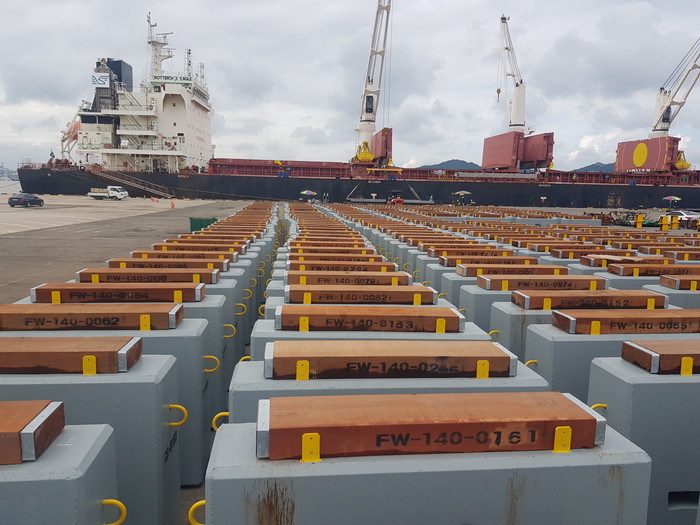 (주)한영산업은 이번 선적을 시작으로 선박 제조용 콘크리트 하부 지지대, 블록 수송용 철근 기둥 등 8종 기자재 8천 톤을 11월까지 3회에 걸쳐 러시아 즈베즈다 조선소에 납품한다.