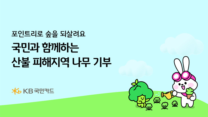 [프레스뉴스] 류현주 기자= KB국민카드(사장 김재관)는 산불 피해 복구를 위해 국민과 함께하는 묘목 기부 캠페인을 진행한다고 밝혔다.