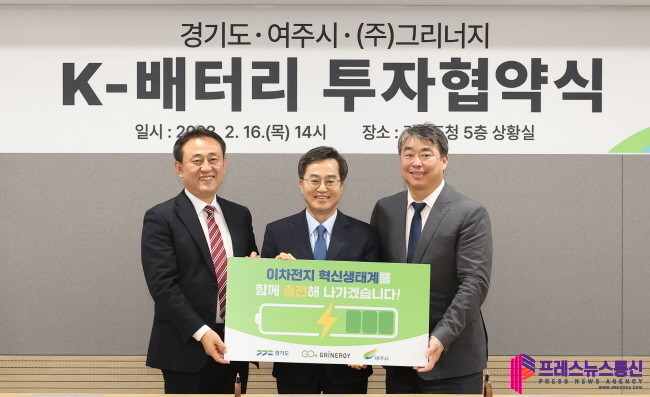 김동연 경기도지사와 이충우 여주시장, 방성용 ㈜그리너지 대표이사는 16일 오후 경기도청에서 이런 내용을 담은 ‘K-배터리 제조시설 건립 및 이차전지 혁신생태계 기반 조성을 위한 투자유치 양해각서’를 체결했다.