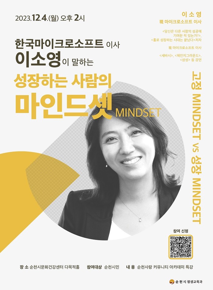 [전남=프레스뉴스] 강래성 기자= 순천시(시장 노관규)는 오는 12월 4일(월) 14시 문화건강센터 다목적홀에서 ‘성장하는 사람의 마인드셋’이라는 주제로 이소영 한국마이크로소프트 이사 초청 강연을 진행한다.