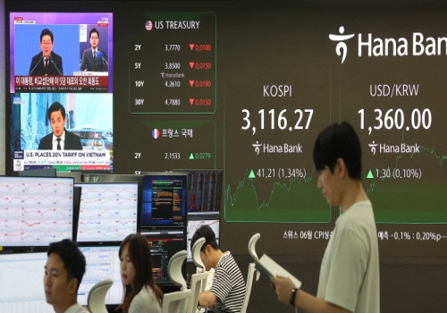 ▲이재명 대통령의 기자회견이 있던 지난 3일 오후 서울 중구 하나은행 본점 딜링룸 전광판에 코스피 종가 현황이 표시돼 있다.(사진= 뉴스1) |