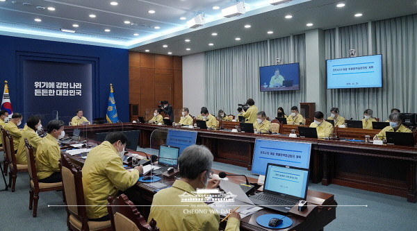 ▲문 대통령이 29일 청와대 여민관 영상회의실에서 열린 코로나19 대응 특별방역점검회의에서 발언하고 있다. (사진=청와대) |