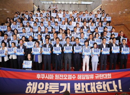 [프레스뉴스] 강보선 기자= 이재명 더불어민주당 대표와 박광온 원내대표 등 의원들이 22일 오후 서울 여의도 국회 로텐더홀에서 열린 긴급 의원총회 및 일본 후쿠시마 원전오염수 해양방류 규탄대회에서 피켓을 들고 구호를 외치고 있다.