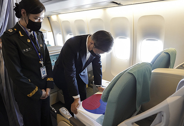▲ 문 대통령이 23일 오후(현지시간) 미국 하와이에서 봉송해 전용기 내에 임시 안치한 국군 전사자 고 김석주 일병의 유해를 고인의 후손인 김혜수 소위와 살펴본 뒤 묵념하고 있다. (사진=청와대) |