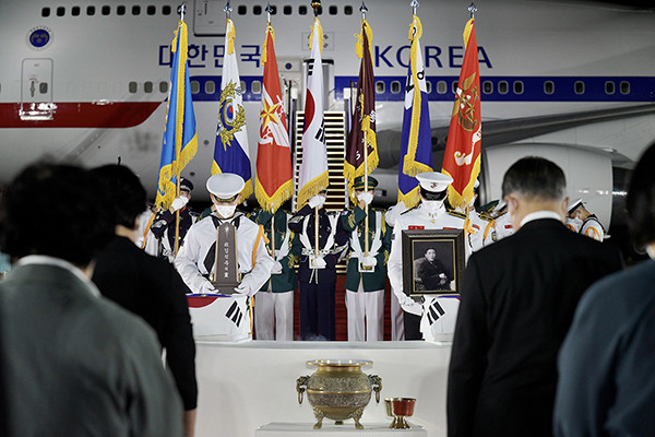 23일 밤 9시30분 서울공항에서 문 대통령이 참석한 가운데 ‘대한민국의 이름으로 당신을 기억하겠습니다’라는 주제로 ‘국군 전사자 유해 봉환식’을 거행했다.